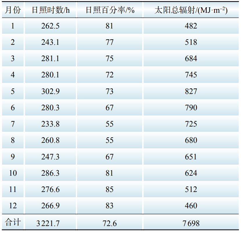 結(jié)合拉薩市氣候?qū)W計(jì)算方法的經(jīng)驗(yàn)系數(shù)和日喀則近30年月平均日照百分率,采用氣候?qū)W方法估算多年平均太陽總輻射如表1所示。由表1可知,該地區(qū)年日照時(shí)長(zhǎng)達(dá)3221.7 h,太陽總輻射達(dá)7698 MJ/m2,為太陽能資源最豐富地區(qū)[20]。