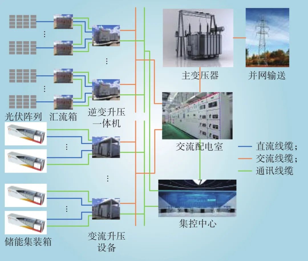 并網(wǎng)光儲(chǔ)電站由光伏發(fā)電系統(tǒng)、儲(chǔ)能系統(tǒng)和并網(wǎng)升壓系統(tǒng)組成。光伏發(fā)電系統(tǒng)包括由光伏組件串聯(lián)組成的光伏陣列、匯流箱和逆變升壓設(shè)備;儲(chǔ)能系統(tǒng)包括儲(chǔ)能集裝箱和變流升壓設(shè)備;并網(wǎng)升壓系統(tǒng)包括交流配電裝置和升壓變壓器等,連接結(jié)構(gòu)如圖3所示。
