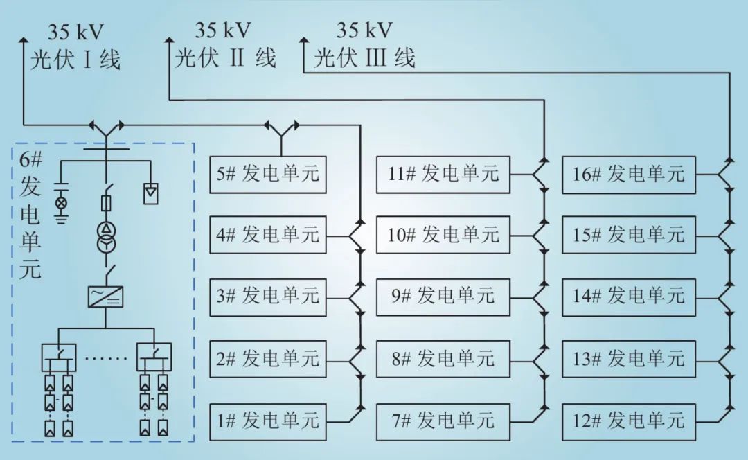 采用“分區(qū)發(fā)電、集中并網(wǎng)”模式將50 MW光伏發(fā)電系統(tǒng)劃分為16個(gè)容量均為3.125 MW的發(fā)電單元,通過并網(wǎng)光伏逆變器將光伏組件所發(fā)直流電轉(zhuǎn)化為交流電,經(jīng)變壓器升壓后接入35 kV交流母線,50 MW光伏發(fā)電系統(tǒng)架構(gòu)如圖4所示。
