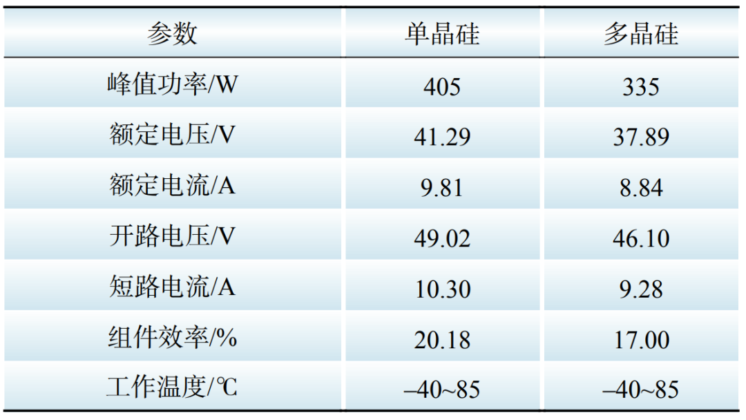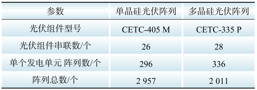 單晶硅光伏組件相較于多晶硅光伏組件具有更好的弱光性、更高的光電轉(zhuǎn)化效率和更低的衰減率,但多晶硅光伏組件技術(shù)更加成熟、綜合成本更低。根據(jù)光伏發(fā)電系統(tǒng)50 MW裝機(jī)容量和場(chǎng)址面積,選用26塊型號(hào)為CETC-405 M的405 W單晶硅光伏組件或28塊型號(hào)為CETC-335 P的335 W多晶硅光伏組件串聯(lián)組成1個(gè)光伏陣列,光伏陣列經(jīng)匯流箱匯流后接入光伏逆變器組成1個(gè)光伏發(fā)電單元,共16個(gè)發(fā)電單元、133190塊光伏組件。光伏陣列設(shè)計(jì)參數(shù)如表2所示,標(biāo)準(zhǔn)測(cè)試條件下(STC:AM1.5;1000 W/m2;25 ℃)2種光伏組件參數(shù)見表3。