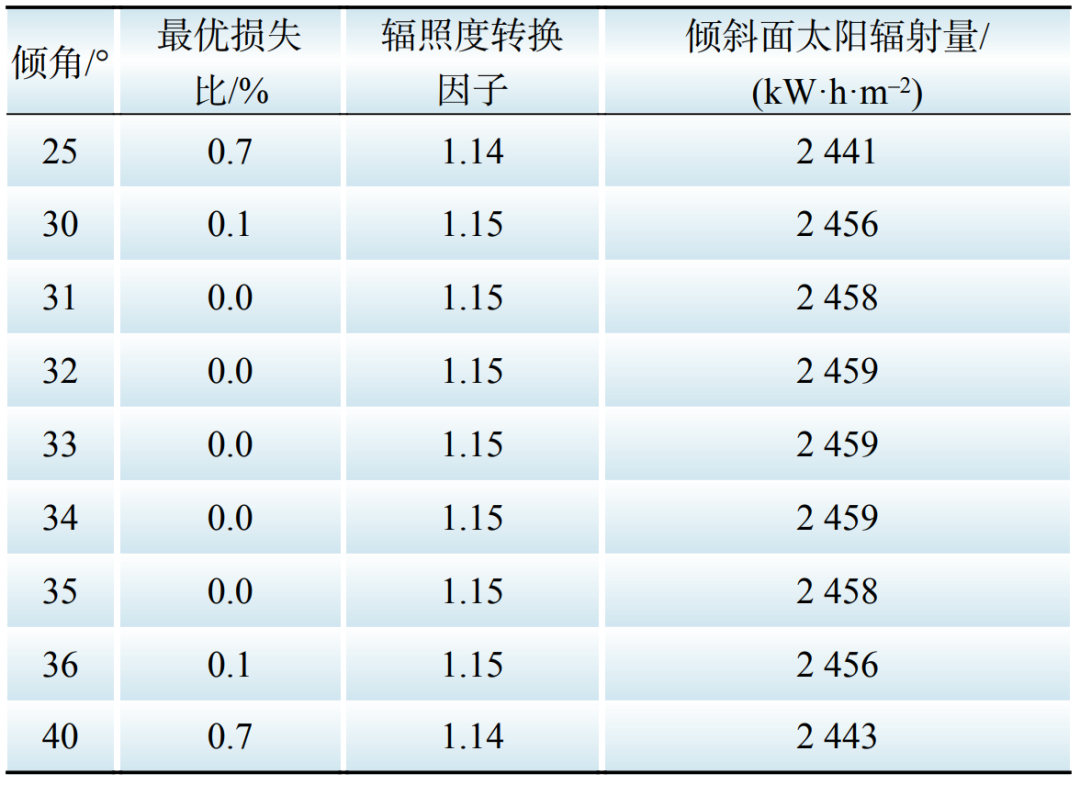 結(jié)合地理位置(北緯29°20′,東經(jīng)89°16′)、氣候特征和太陽總輻射,利用PVsyst軟件模擬該地區(qū)不同傾角下的相對(duì)于最優(yōu)化的損失比(最優(yōu)損失比)、輻照度轉(zhuǎn)換因子和傾斜面太陽輻射量,如表4所示。