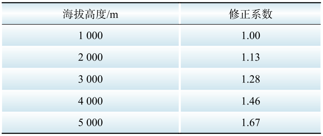 逆變器作為將光伏組件所發(fā)直流電轉(zhuǎn)化為電網(wǎng)所需交流電的核心設(shè)備,影響著整個(gè)光伏電站輸出功率與輸出電能質(zhì)量。大氣壓力、空氣密度和濕度隨海拔升高而逐漸降低,進(jìn)而會(huì)導(dǎo)致電氣設(shè)備絕緣強(qiáng)度和散熱性能下降。海拔在5 000 m范圍內(nèi),每上升1 000 m,平均氣壓下降7.7~10.5 kPa,電氣設(shè)備外絕緣強(qiáng)度下降8%~13%,溫升增加3%~10%,環(huán)境溫度降低6 ℃;以海拔1000 m為基準(zhǔn),為保證電氣設(shè)備在高海拔地區(qū)安全使用,須對(duì)其電氣間隙按照表5所示系數(shù)進(jìn)行修正[19]。