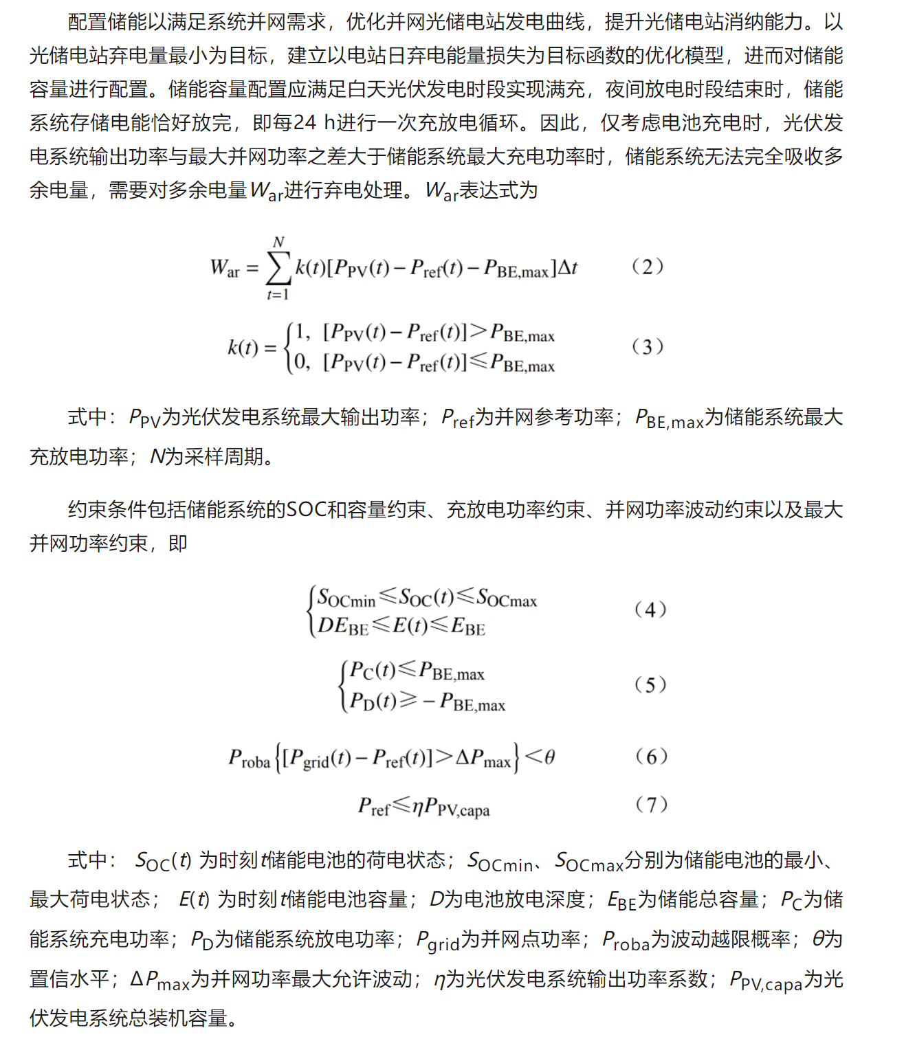 “雙碳”目標(biāo)推動(dòng)了集中式并網(wǎng)光儲(chǔ)電站快速發(fā)展,國內(nèi)外學(xué)者對(duì)光儲(chǔ)電站的選型設(shè)計(jì)開展了較多的研究。文獻(xiàn)[11]從光伏組件的性能、成本和空間要求分析了不同組件的適用范圍,為光伏電站的開發(fā)利用提供了參考;文獻(xiàn)[12]研究了不同類型光伏組件在不同季節(jié)、太陽輻照度和溫度相同情況下輸出功率的差異性,對(duì)比實(shí)驗(yàn)結(jié)果得到晶硅光伏組件效率受光譜影響較小,具有更強(qiáng)的環(huán)境適應(yīng)能力;文獻(xiàn)[13]分析了不同光伏組件和排布方式的經(jīng)濟(jì)性,提出了光伏電站優(yōu)化設(shè)計(jì)方案;文獻(xiàn)[14]針對(duì)集中式和分布式能源系統(tǒng),考慮技術(shù)約束、經(jīng)濟(jì)和環(huán)境因素,提出了適用不同系統(tǒng)的儲(chǔ)能方式,并通過實(shí)例驗(yàn)證了可行性。