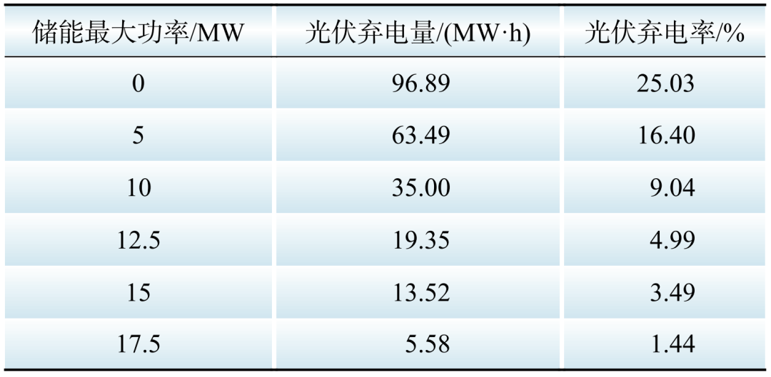 表6 配置不同功率儲(chǔ)能系統(tǒng)的光伏棄電損失