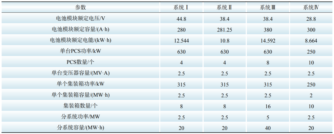 各儲(chǔ)能分系統(tǒng)所用單體電池均為額定電壓3.2 V的磷酸鐵鋰電池,由表7可知,儲(chǔ)能分系統(tǒng)Ⅰ、Ⅱ、Ⅳ功率/容量配置相同,均為2.5 MW/20 MW·h,儲(chǔ)能分系統(tǒng)Ⅲ為兩組完全相同的2.5 MW/20 MW·h儲(chǔ)能單元組成。其中,分系統(tǒng)Ⅰ、Ⅱ所用電池模組電壓不同;分系統(tǒng)Ⅱ、Ⅲ所用電池模組電壓相同,但容量不同。