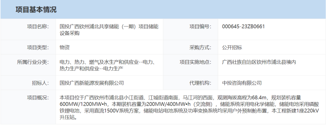 中國儲能網(wǎng)訊:近日,國投廣西欽州浦北共享儲能(一期)項目儲能設(shè)備采購,項目規(guī)劃裝機容量600MW/1200MWh,本期裝機容量為200MW/400MWh(交流側(cè)),儲能系統(tǒng)采用電化學(xué)儲能,儲能電池采用磷酸鐵鋰電池,采用直流1500V系統(tǒng)方案,儲能電站電池系統(tǒng)及功率變換系統(tǒng)均采用戶外預(yù)制艙布置,本工程新建1座220kV升壓站。