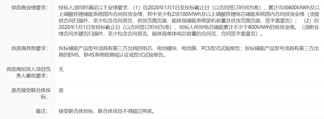 要求投標(biāo)人須為電芯制造商且為儲能系統(tǒng)集成商,電芯制造商與儲能系統(tǒng)集成商的聯(lián)合體,儲能系統(tǒng)集成商應(yīng)至少能生產(chǎn)儲能系統(tǒng)中BMS、PCS或EMS的一項。