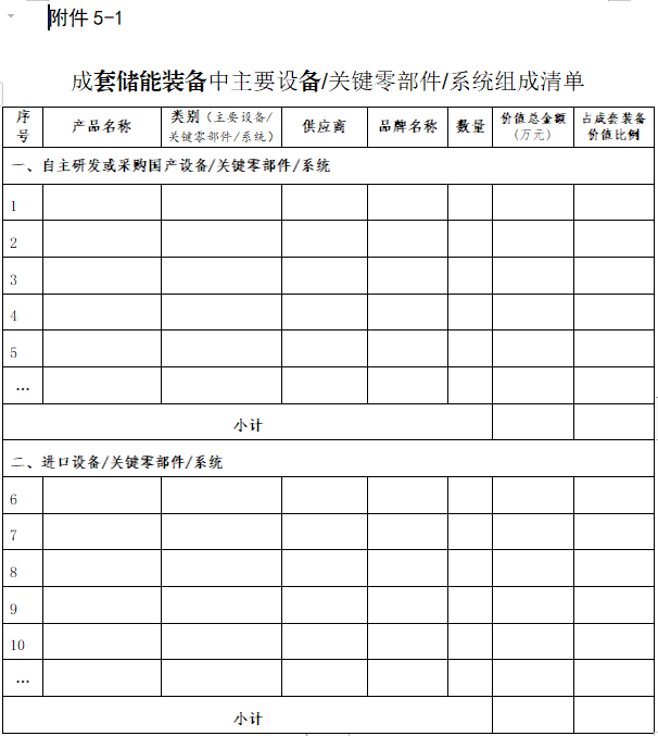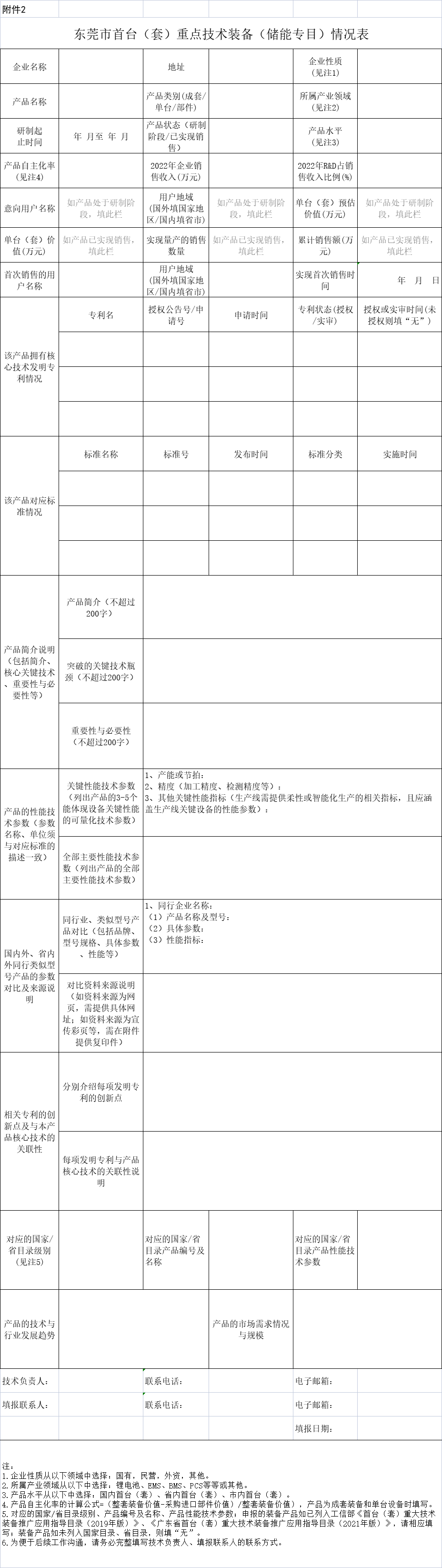 1、《東莞市首臺(套)重點技術(shù)裝備(儲能專目)情況表》(按照裝備產(chǎn)品處于研制階段、已實現(xiàn)首次銷售分別填寫不同表格);