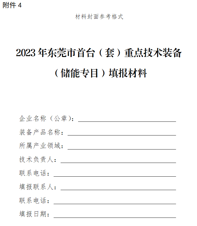 請相關(guān)儲能裝備制造業(yè)企業(yè)按要求認(rèn)真填寫《東莞市首臺(套)重點技術(shù)裝備(儲能專目)情況表》(見附件2),并將附件2及相關(guān)證明附件裝訂成冊。具體如下:
