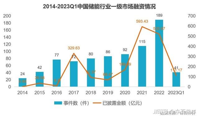 在投融資上,儲(chǔ)能行業(yè)也成為一級(jí)市場(chǎng)投資新熱點(diǎn),其熱度持續(xù)高漲,尤其是2022年,儲(chǔ)能融資處于爆發(fā)期。據(jù)睿獸分析統(tǒng)計(jì),2022年,我國(guó)儲(chǔ)能行業(yè)融資事件189件,同比增長(zhǎng)64.3%,融資金額520.97億元,也處于高位。