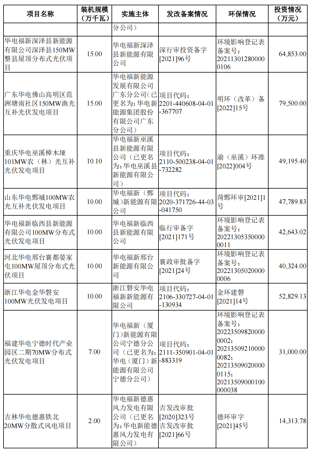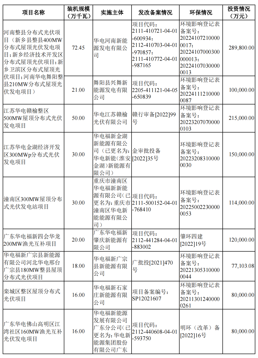 華電新能源在中東部負荷中心及周邊地區(qū)開發(fā)建設(shè)分散式風(fēng)電和分布式光伏,充分發(fā)揮負荷中心就地生產(chǎn)就地消納特色,積極探索光伏與其他產(chǎn)業(yè)的融合,布局光伏復(fù)合以及整縣光伏等“就地消納負荷中心項目”,項目平均資本金凈利潤率為 11.24%,平均投資回收期(稅后)為 13.00 年,具體項目如下表。