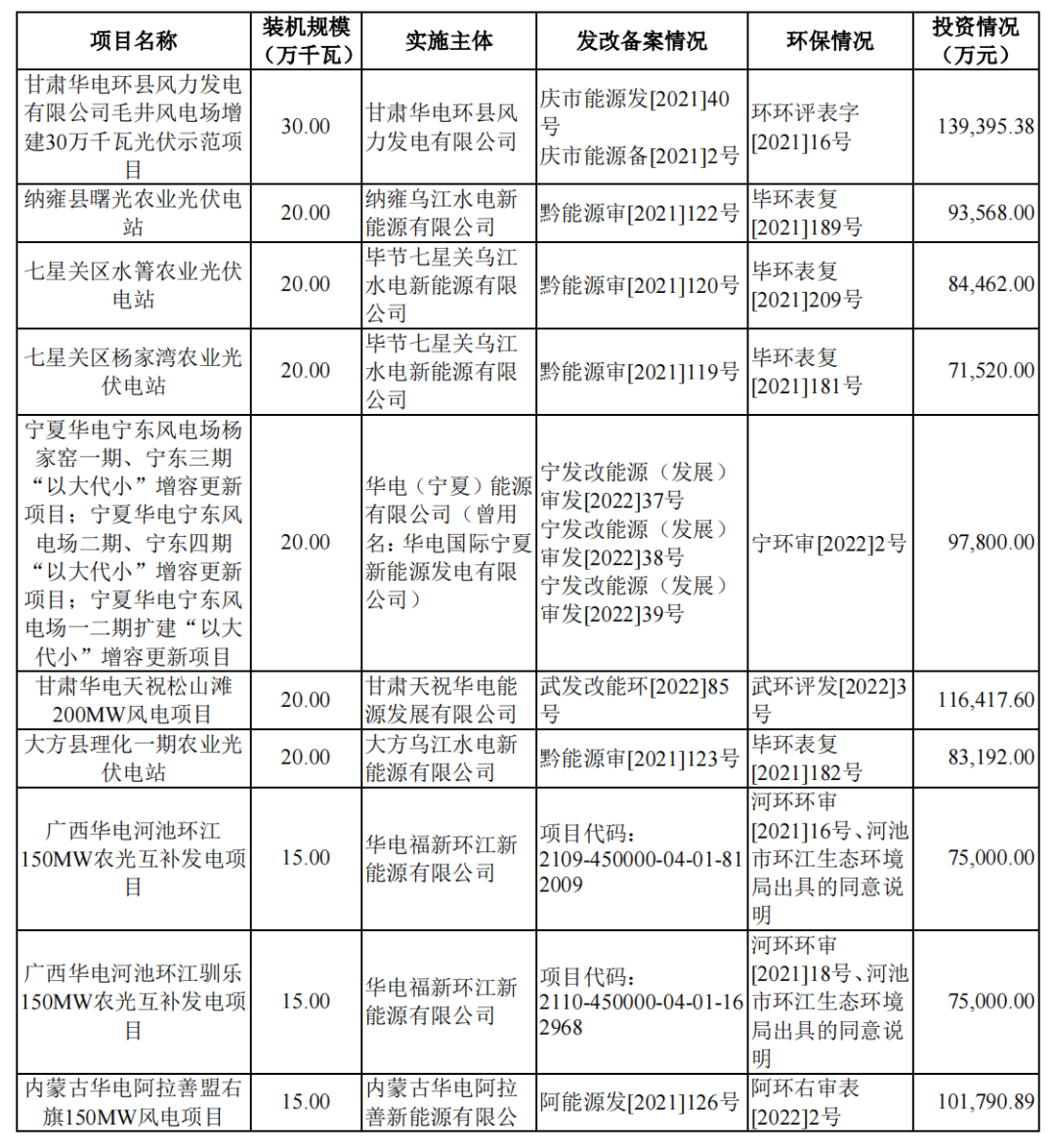 華電新能源在風(fēng)光資源較好位置配套儲能可以調(diào)和新能源間歇性、波動性,公司積極在甘肅、貴州等地布局風(fēng)光配儲“新型電力系統(tǒng)協(xié)同發(fā)展項目”,項目平均資本金凈利潤率為 11.30%,平均投資回收期(稅后)為 12.86 年,具體項目如下表。