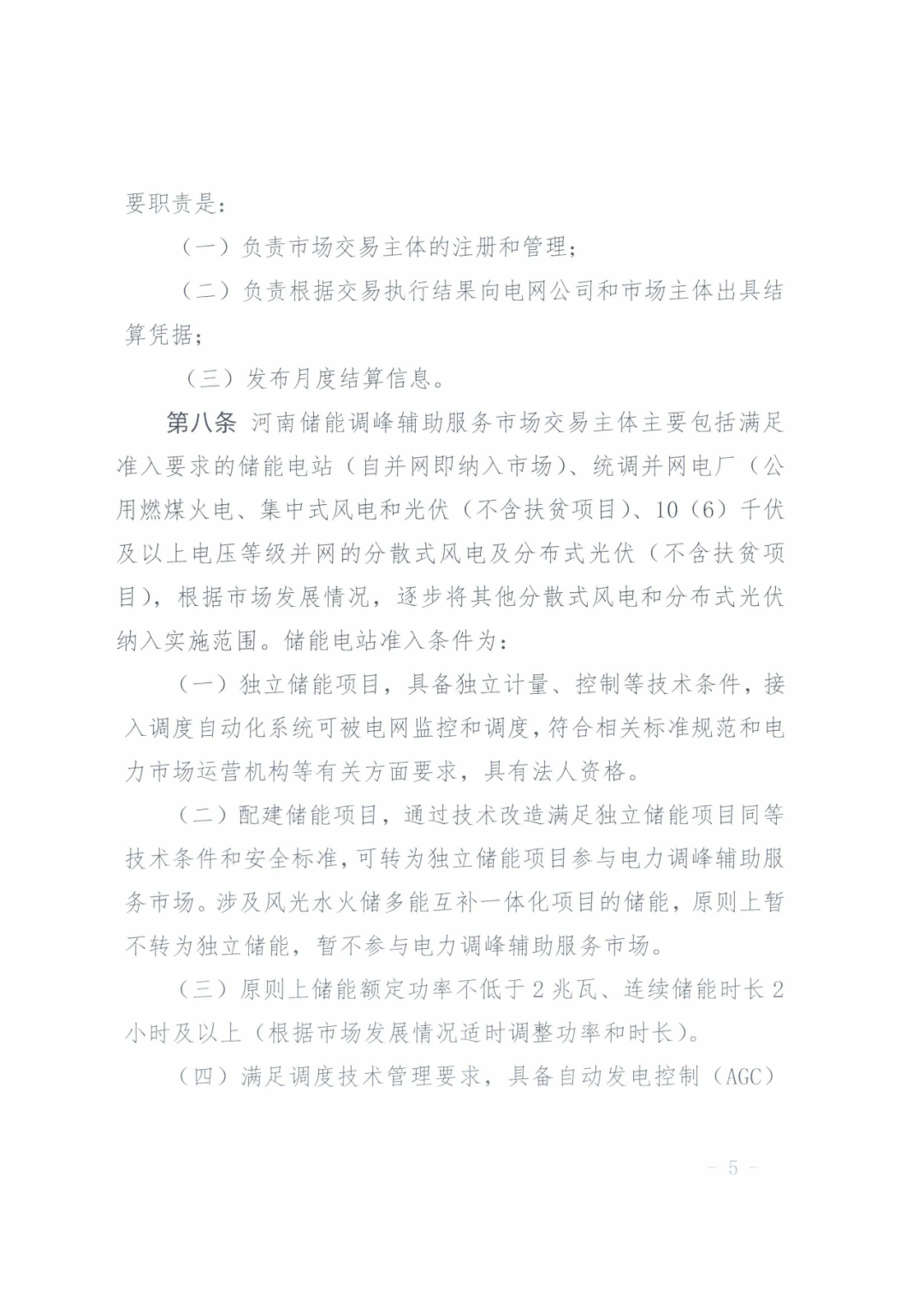 (四)滿足調(diào)度技術(shù)管理要求,具備自動發(fā)電控制 (AGC)功能,能夠可靠接收和執(zhí)行調(diào)度機(jī)構(gòu) AGC 系統(tǒng)實時下達(dá)的充放電指令,其調(diào)節(jié)速率、調(diào)節(jié)范圍、響應(yīng)時間和調(diào)節(jié)精度等性能指標(biāo)滿足相關(guān)標(biāo)準(zhǔn)要求。