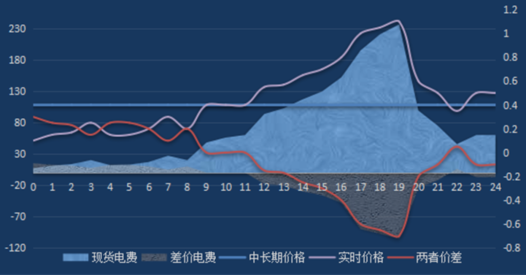 從圖1可以看出,該電源現(xiàn)貨電費為天藍(lán)色區(qū)域,面積即為現(xiàn)貨電費數(shù)量,為正值,但是價差電費在(差價合同結(jié)算)0~11時、22時不為負(fù),其他時段均為負(fù),好在天藍(lán)色區(qū)域面積加上為正的灰色面積大于為負(fù)的灰色面積,該電源當(dāng)天電費結(jié)算的總額仍然是正值,這是蒙西市場大部分電源電費結(jié)算的示意圖。那么大烏海區(qū)域的部分發(fā)電企業(yè)為何會發(fā)生“付錢發(fā)電”的情況呢?