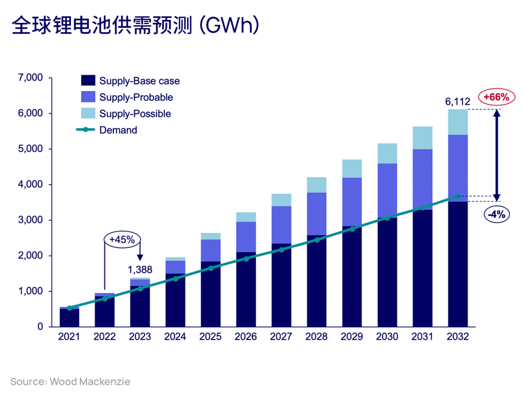 伍德麥肯茲最新預(yù)測(cè)數(shù)據(jù)顯示,2023年,全球鋰電池產(chǎn)量有望增長(zhǎng)45%,超過(guò)1380GWh,而需求約為1080GWh。根據(jù)電池供應(yīng)商公布的擴(kuò)產(chǎn)項(xiàng)目,2032年,鋰電池產(chǎn)量可能高達(dá)6100GWh,但由于當(dāng)年需求前景約為3700GWh,因此,項(xiàng)目取消的可能性很大。