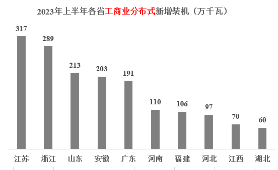 2023年上半年工商業(yè)分布式光伏裝機(jī)規(guī)模為1944萬(wàn)千瓦,前三的省份分別為:江蘇、浙江、山東;前十省份合計(jì)1656萬(wàn)千瓦,占到全國(guó)新增光伏裝機(jī)的85%。新增光伏總裝機(jī)前十省份的具體情況如下圖所示。