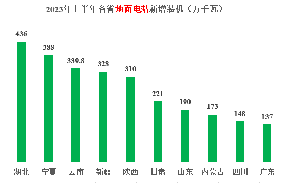2023年上半年地面電站裝機(jī)3746萬(wàn)千瓦,前三的省份分別為:湖北、寧夏、云南;前十省份合計(jì)2672萬(wàn)千瓦,占到全國(guó)新增光伏裝機(jī)的71%。新增光伏總裝機(jī)前十省份的具體情況如下圖所示。