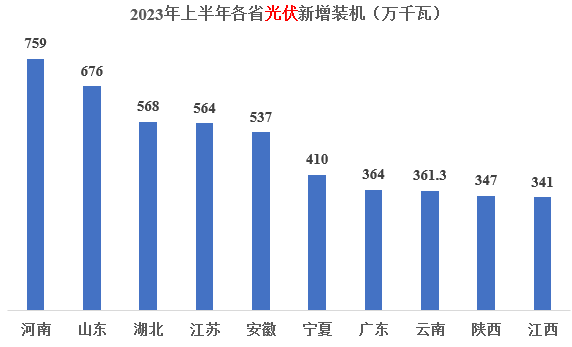 2023年上半年戶用裝機(jī)規(guī)模為2152萬(wàn)千瓦,前三的省份分別為:河南、山東、河北;前十省份合計(jì)1969萬(wàn)千瓦,占到全國(guó)新增光伏裝機(jī)的91%。新增光伏總裝機(jī)前十省份的具體情況如下圖所示。
