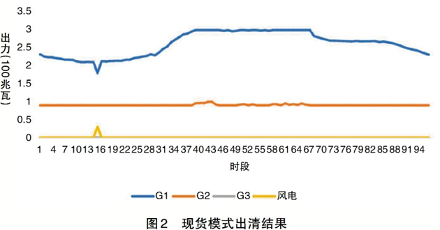 模式2:現(xiàn)貨市場模式。在該模式中,不設置調(diào)峰市場且機組首段報價出力不受50%的限制,機組申報任何出力均可用于定價,市場出清結(jié)果如圖2所示。由于機組均將最小出力30%作為報價首段,兩臺機組的最小出力和加上風電出力小于系統(tǒng)低谷時的負荷,運行G1和G2不會導致棄風。而且相對成本較高的G2下調(diào)出力,為成本較低的G1留出了發(fā)電空間,進一步降低了系統(tǒng)發(fā)電成本,在現(xiàn)貨模式下,用戶需支付的全天發(fā)電總成本為190.57萬元,在解決棄風問題的同時,相對模式1又降低了發(fā)電成本14.37萬元,釋放了社會福利并使得用戶購電費用降低。