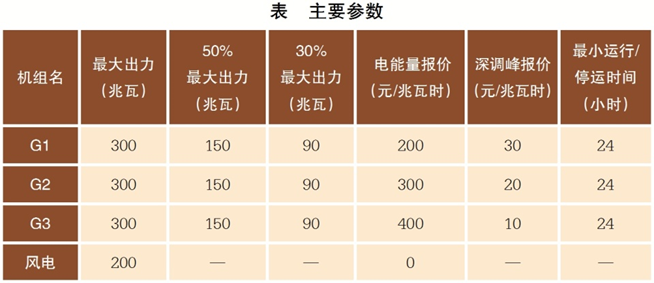 在該模型中,第15時段為最小負荷300兆瓦,第42時段為最大負荷399.8兆瓦,并假設風電出力30兆瓦只發(fā)生在15時段。