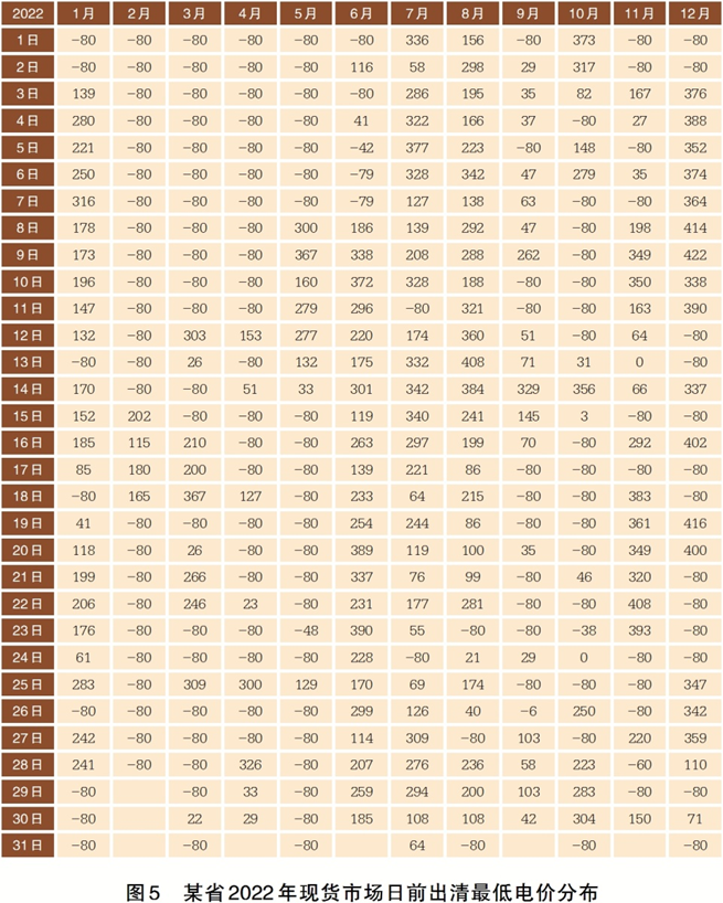 除峰谷比以外,通過(guò)該省的現(xiàn)貨市場(chǎng)出清價(jià)格也能看出一些端倪。據(jù)統(tǒng)計(jì),2022年該省日前出清出現(xiàn)負(fù)價(jià)的天數(shù)達(dá)161天,這一數(shù)字與峰谷比>2的天數(shù)156天基本一致。因?yàn)榛痣姍C(jī)組不太可能會(huì)報(bào)負(fù)價(jià),出清負(fù)價(jià)就意味著市場(chǎng)化火電機(jī)組全部都已經(jīng)不定價(jià)了,也就是說(shuō)即使所有煤機(jī)都降至第一點(diǎn)出力(深調(diào)極限出力或最低技術(shù)出力)中午谷段還是過(guò)不去。風(fēng)光不能棄、外電難壓降,此時(shí)省內(nèi)火電機(jī)組停機(jī)幾乎就是必然的選擇(見圖5)。