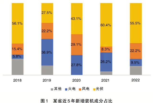 以上述現(xiàn)貨試點(diǎn)省份為例。該省近年來(lái)新能源裝機(jī)增長(zhǎng)勢(shì)頭迅猛,近5年新增裝機(jī)中新能源裝機(jī)占比近70%,其中光伏占比近50%(見圖1)。