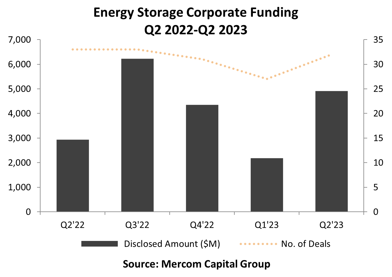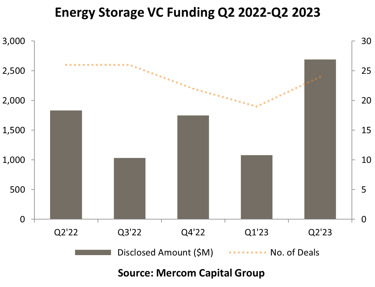 儲能公司的風(fēng)險投資(VC)資金增長強勁,2023年上半年達成43筆交易籌集了38億美元,而2022年上半年達成48筆交易籌集了30億美元,因此同比增長27%。