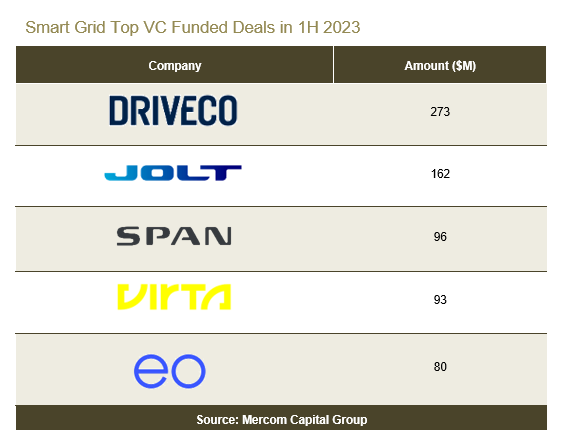 在2023年上半年,也有幾筆值得注意的智能電網(wǎng)風(fēng)險投資(VC)融資交易。排名前五的交易包括Driveco公司獲得了令人印象深刻的2.73億美元,Jolt Energy公司獲得1.62億美元,SPAN公司獲得9600萬美元;Virta公司獲得9300萬美元,以及EOCharging公司獲得8000萬美元。
