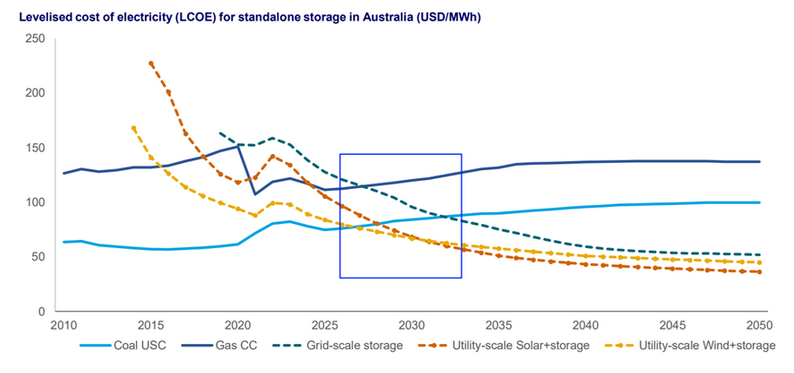 目前,與其他可調(diào)度發(fā)電設(shè)施相比,獨立部署的電網(wǎng)規(guī)模儲能系統(tǒng)的度電成本(LCOE)仍然高昂,但根據(jù)Wood Mackenzie公司的調(diào)查,到2032年,儲能系統(tǒng)的成本大幅降低將削弱天然氣發(fā)電的競爭力。