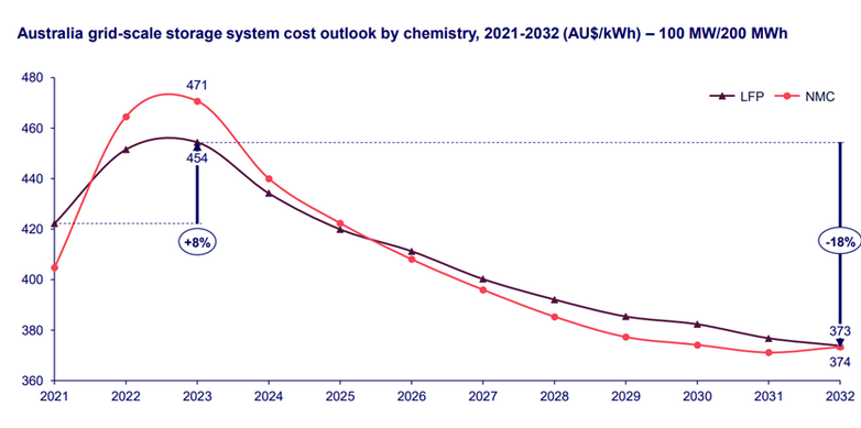 由于在澳大利亞部署的儲能項目主要針對高價值的頻率控制和輔助服務(wù)(FCAS)市場,持續(xù)時間為兩小時的電網(wǎng)規(guī)模電池儲能系統(tǒng)目前是主流的儲能技術(shù)。到2032年,預(yù)計磷酸鐵鋰電池(LFP)和NMC三元鋰離子電池價格將下降40%以上。這反過來將推動電池儲能系統(tǒng)成本在未來十年內(nèi)下降18%至21%,這成為削減資本支出的最大動力。