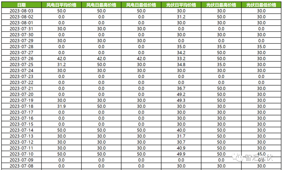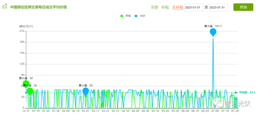 目前,風電、光伏的無補貼綠證的交易價格集中在30~50元/張。2023年1~7月的平均交易價格為42.4元/張。如下圖所示。