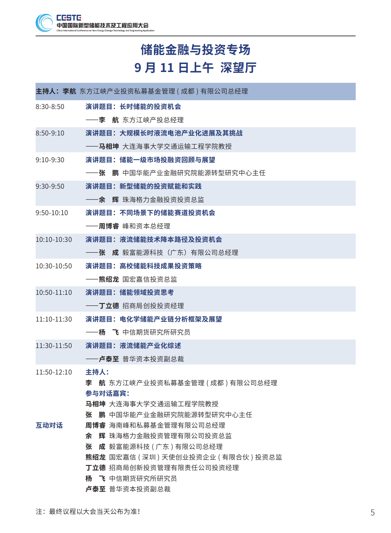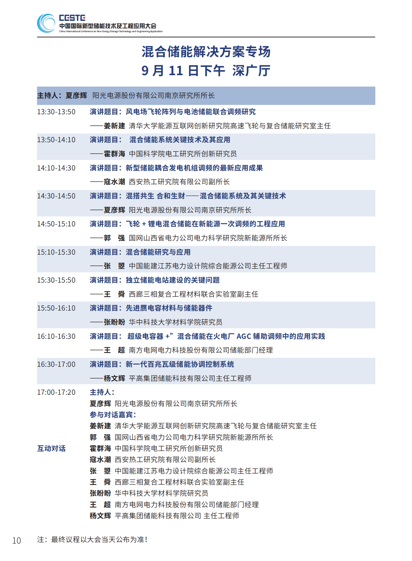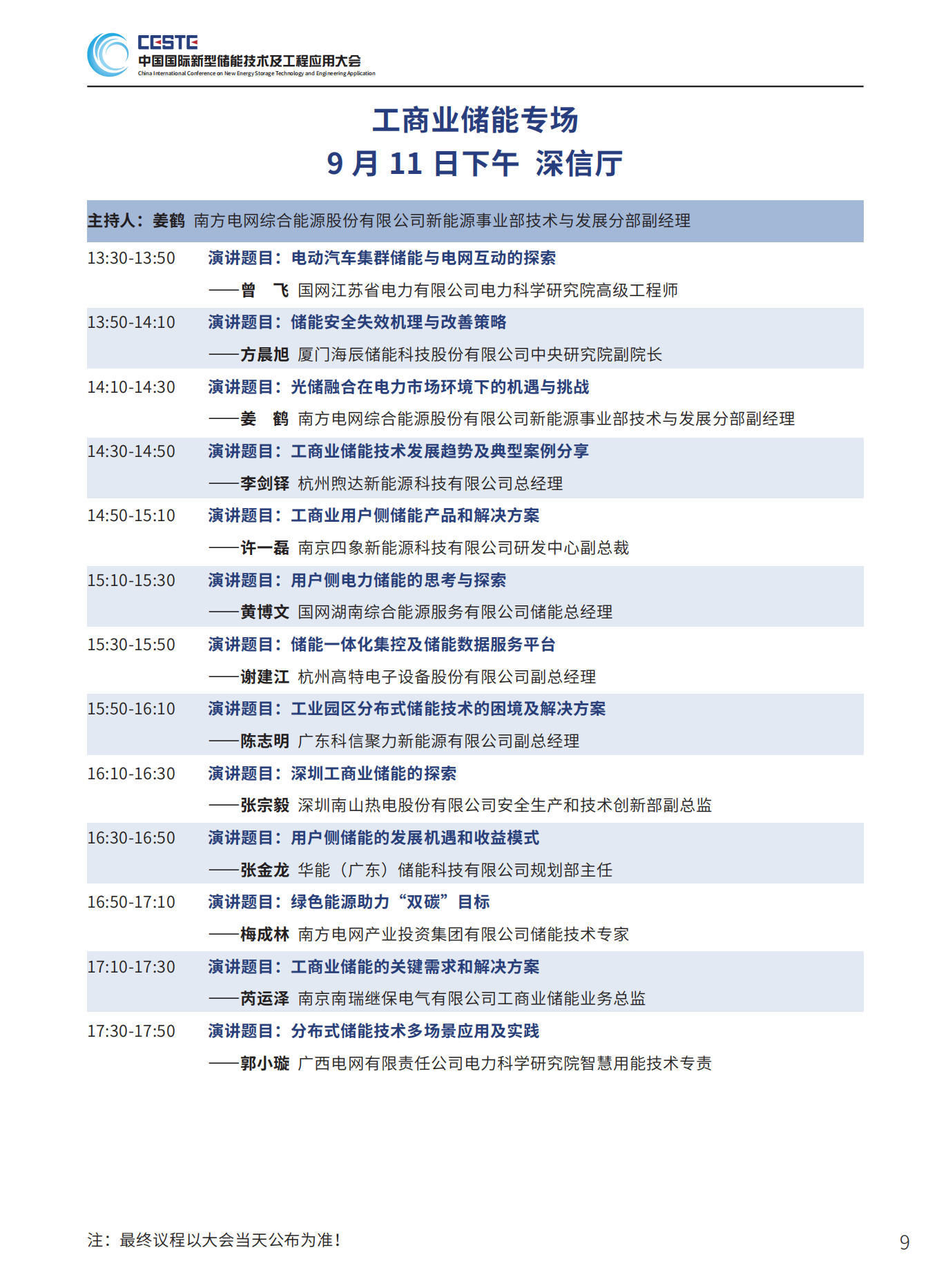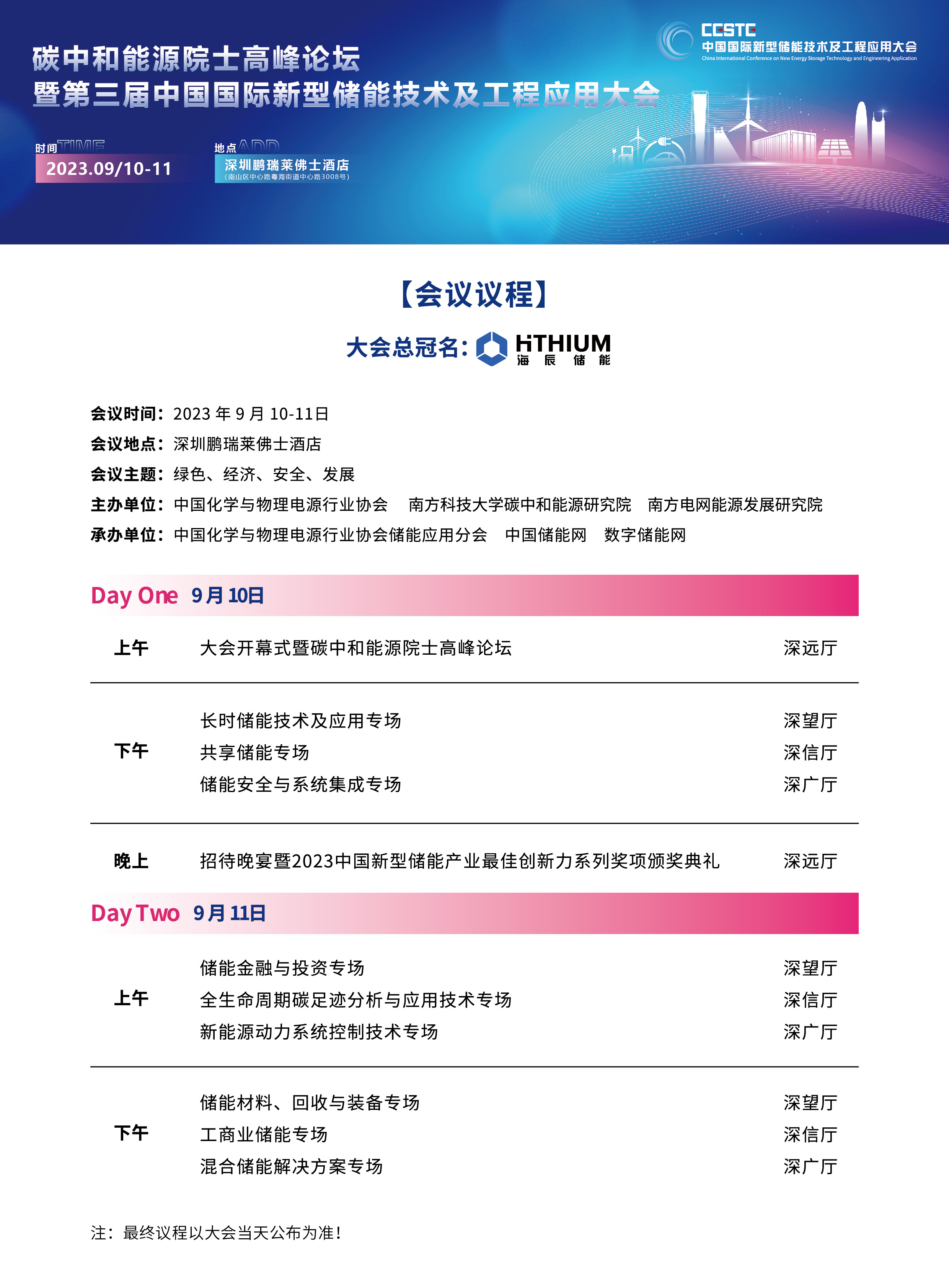 中國儲能網(wǎng)訊:由中國化學(xué)與物理電源行業(yè)協(xié)會決定聯(lián)合南方科技大學(xué)碳中和能源研究院、南方電網(wǎng)能源發(fā)展研究院等儲能領(lǐng)域的100余家單位共同支持的“碳中和能源院士高峰論壇暨第三屆中國國際新型儲能技術(shù)及工程應(yīng)用大會”將于2023年9月10-11日在深圳鵬瑞萊佛士酒店召開,以下為大會議程(最終議程以大會當(dāng)天公布為準(zhǔn))。