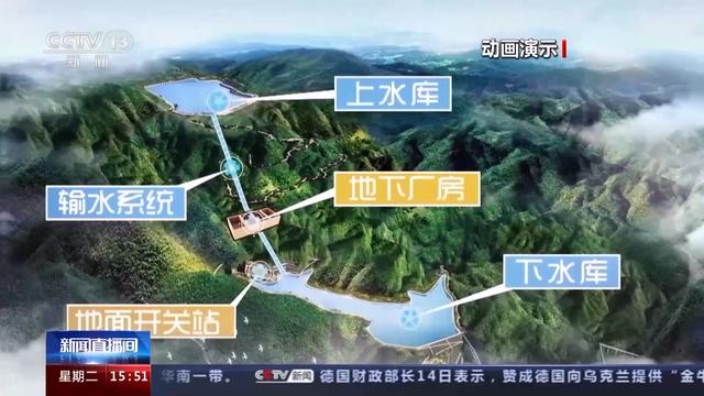 總臺(tái)記者 米笑磊:我現(xiàn)在在抽水蓄能電站的上水庫,它的面積是0.416平方公里,相當(dāng)于58個(gè)標(biāo)準(zhǔn)足球場,可儲(chǔ)存1168萬立方米的水。它的海拔是410米,在245米下,還有一座下水庫。當(dāng)電力系統(tǒng)負(fù)荷不高時(shí),發(fā)電機(jī)組會(huì)將下水庫的水抽到上水庫,將電能轉(zhuǎn)化為水的勢能儲(chǔ)存;在電力系統(tǒng)負(fù)荷較高時(shí),上水庫的水沖轉(zhuǎn)發(fā)電機(jī)組流向下水庫,這一過程產(chǎn)生的勢能帶動(dòng)發(fā)電機(jī)組完成發(fā)電,從而順利提供電能。