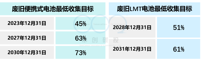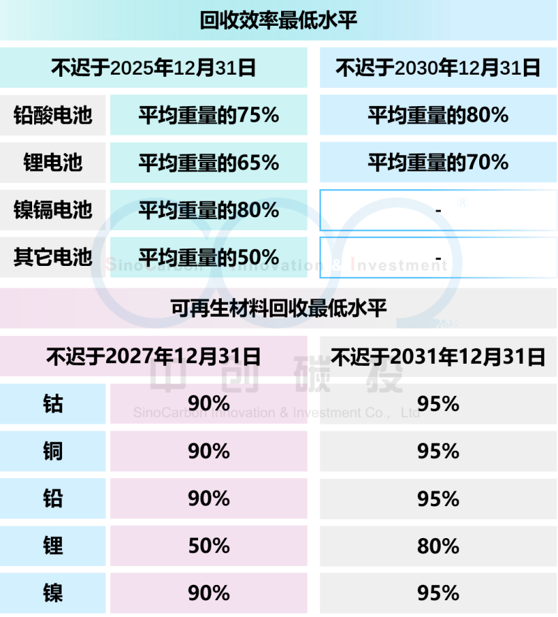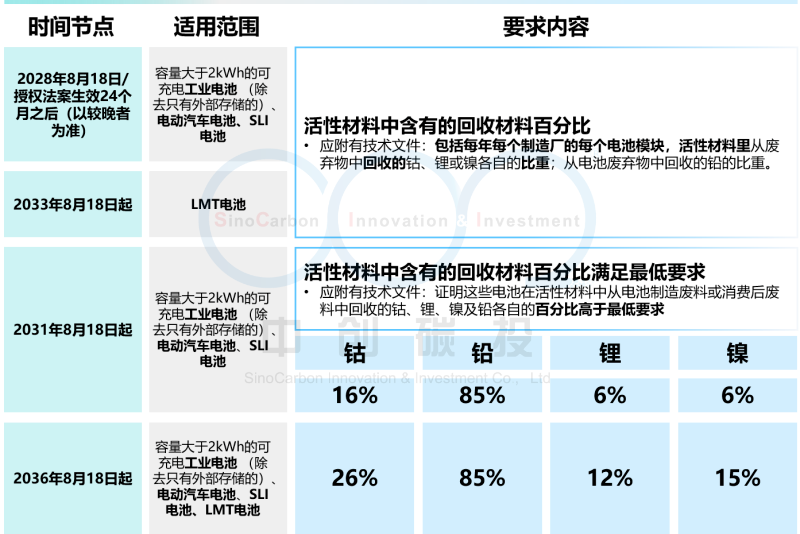 工業(yè)電池、電動(dòng)汽車電池、LMT電池和SLI電池中的回收成分需滿足以下要求: