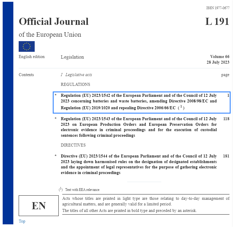 歐盟電池與廢舊電池法規(guī)就是綠色新政體系中的重要一環(huán)。其最早成型于2017年10月的“歐洲電池聯(lián)盟”合作平臺(tái)。經(jīng)過多輪的修改討論,2023年7月10日,歐盟理事會(huì)通過了電池法規(guī);2023年7月28日,法規(guī)在歐盟官方公報(bào)上公布,于20天之后的今天正式生效。