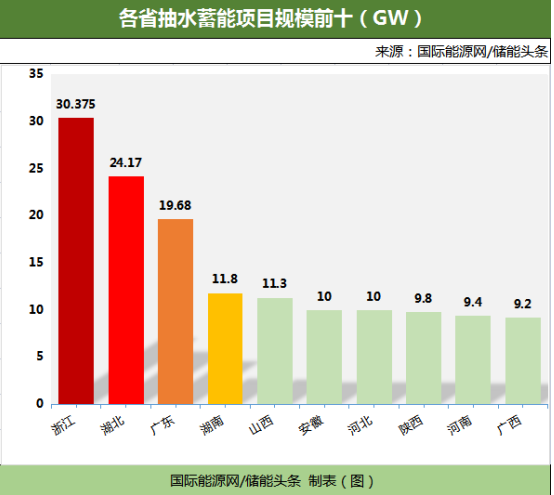 據(jù)統(tǒng)計,截至目前全國已規(guī)劃了183抽水蓄能項目。其中73個抽水蓄能電站項目已開工,裝機容量達91.38GW;110個抽水蓄能電站項目擬建設,裝機容量達136.475GW。從項目所在地區(qū)來看,項目分布于浙江、湖北、廣東、湖南、山西、安徽、河北、陜西等26個省市,浙江以30.375GW排名第一,湖北以24.17GW排名第二,廣東以19.68GW排名第三。湖南、山西、安徽、河北、陜西、河南、廣西7省項目規(guī)模均超9GW。
