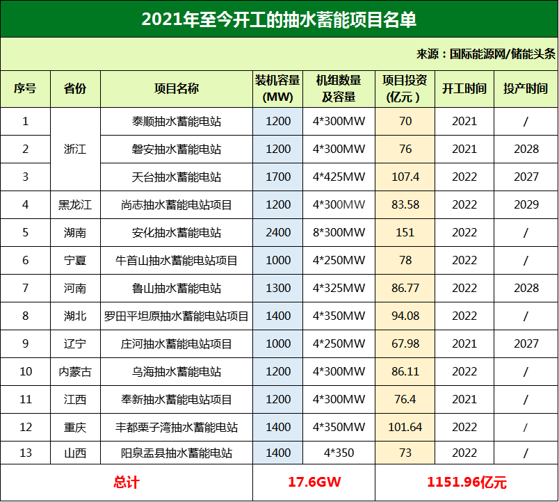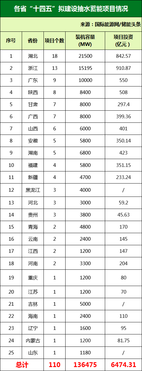 根據(jù)國家及地方“十四五”規(guī)劃公開數(shù)據(jù),國際能源網(wǎng)統(tǒng)計了110個正在推進的抽水蓄能項目,總投資超6504.31億元,容量規(guī)模達136.475GW。