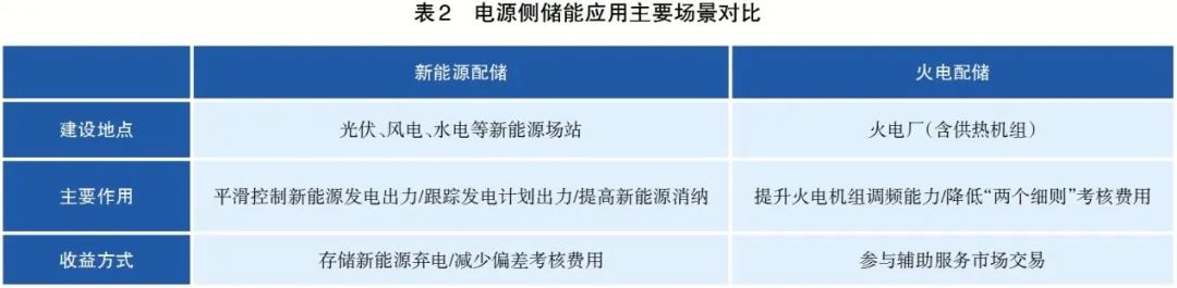 電源側(cè)儲能通常是指與常規(guī)電廠、風(fēng)電場、光伏電站等電源廠站相連接,以平滑新能源功率曲線、促進(jìn)新能源消納、提升火電機(jī)組涉網(wǎng)性能等為目的建設(shè)的儲能電站。中電聯(lián)統(tǒng)計(jì)數(shù)據(jù)表明,截至2022 年底,電源側(cè)儲能在建211座、裝機(jī)7.50吉瓦/21.27吉瓦時(shí),累計(jì)投運(yùn)263座、裝機(jī)3.97吉瓦/ 6.80吉瓦時(shí),同比增長131.81%。電源側(cè)儲能常見的應(yīng)用場景包括新能源配儲、火電配儲等,其中新能源配儲電站累計(jì)投運(yùn)總能量占電源側(cè)比例超過80%,電源側(cè)儲能應(yīng)用主要場景對比詳見表2。