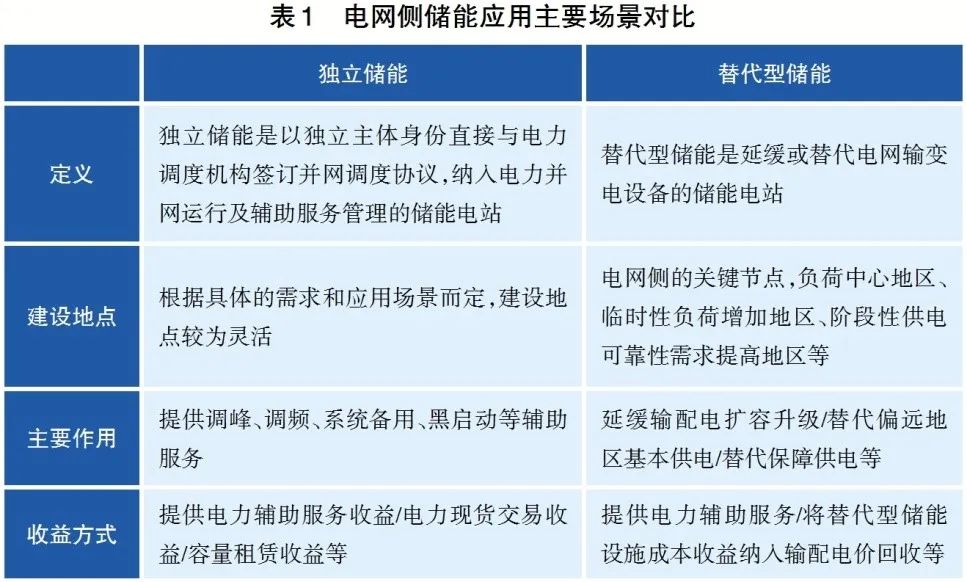 電網(wǎng)側(cè)儲能通常是指服務(wù)電力系統(tǒng)運(yùn)行,以協(xié)助電力調(diào)度機(jī)構(gòu)向電網(wǎng)提供電力輔助服務(wù)、延緩或替代輸變電設(shè)施升級改造等為主要目的建設(shè)的儲能電站。中電聯(lián)統(tǒng)計(jì)數(shù)據(jù)表明,截至2022年底,電網(wǎng)側(cè)儲能在建55座、裝機(jī)4.08吉瓦/7.52吉瓦時(shí),累計(jì)投運(yùn)78座、裝機(jī)2.44吉瓦/5.43吉瓦時(shí),同比增長165.87%。電網(wǎng)側(cè)儲能主要的應(yīng)用場景包括獨(dú)立儲能(包括共享儲能等)、替代型儲能(包括變電站、移動電源車等),其中獨(dú)立儲能累計(jì)投運(yùn)總能量,在電網(wǎng)側(cè)儲能電站累計(jì)投運(yùn)總能量中占比接近90%,電網(wǎng)側(cè)儲能應(yīng)用主要場景對比詳見表1。
