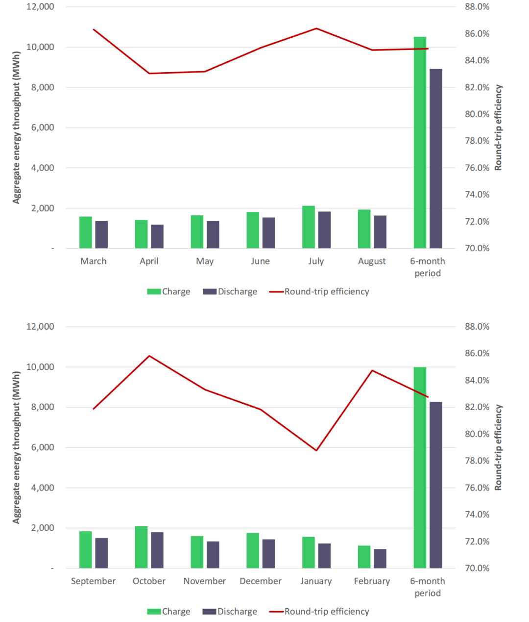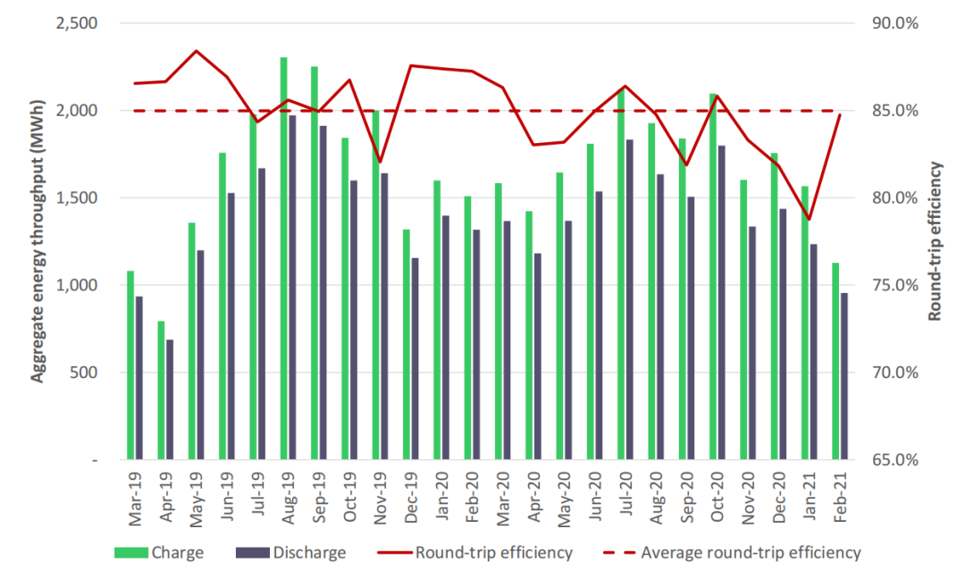 如圖 8 所示,截至 2020 年 8 月的 6 個月期間,GESS 的平均往返效率為 84.9%,截至 2021 年 2 月的 6 個月期間,平均往返效率為 82.8%,在約 79-86% 之間波動。請注意,此往返效率計算是在設施收益表上根據觀察到的市場購買和出售的總能源(即總排放/總充電)進行的。因此,它包含系統損失余額,并且未針對 MLF 進行調整。這是一種與正式性能測試不同且更近似的計算,正式性能測試將規(guī)定標準測試條件,包括充電和放電的額定功率以及充電和放電之間的定義時間段。