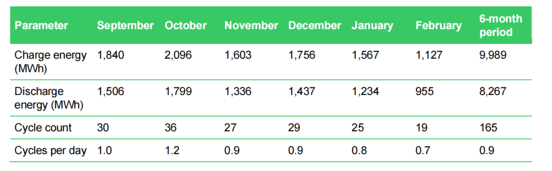 自 3 月初以來,GESS 平均每天運行一個循環(huán),截至 2020 年 8 月的 6 個月內,總充電能量為 10,510 MWh,放電能量為 8,920 MWh,6 個月內分別為 9,989 MWh 和 8,267 MWh。截至 2021 年 2 月的一個月。與前一年類似,進入夏季的肩季觀察到了最大的循環(huán)行為。表 7 總結了截至 2020 年 8 月的 6 個月期間的充電和放電循環(huán)結果,表 8 總結了截至 2021 年 2 月的 6 個月期間。