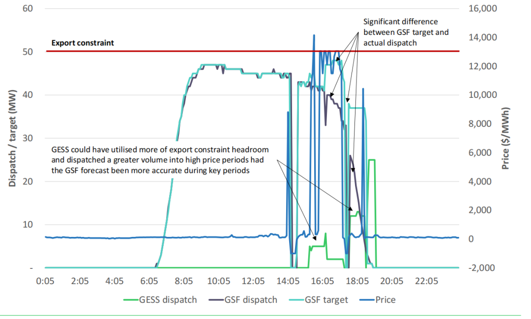 2019 年 3 月 1 日強調的問題(下圖 7),即太陽能預測的不準確降低了 GESS 的調度效率,從而導致收入損失,但在報告期內沒有再次出現。由于報告期內波動性保持在最低限度,僅觀察到三個交易區(qū)間的價格高于 1,000 美元/MWh,所有這些都發(fā)生在太陽能發(fā)電場 0MW 輸出期間。