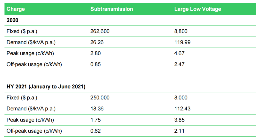 正如之前報告提及,向 Powercor 注冊 GSF 和 GESS 電網接入需繳納 Powercor 征收的 DUOS 費用。由于 GESS 是主要負荷源,因此大部分 DUOS 費用都會流向 GESS。分配給組合系統的DUOS 是子輸電類別(ST),通常為子輸電客戶(而不是發(fā)電機組)使用。在連接 GESS 之前,GSF 僅受大型低壓(LLV)電價等級的約束,其中輔助功耗的最大夜間負載較低(約為 150kW),因此這不是材料成本的負擔。相比之下,現在對 GESS 征收的固定費用和需量費用相當可觀。表 4 概述了 2020 年和 2021 年上半年適用的每個 ST 和 LLV Powercor 費率類別的費用。