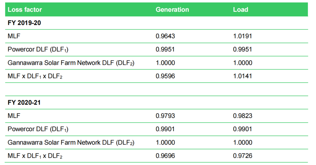 將 GESS 的線損應用到 區(qū)域參考節(jié)點(RRN ) 的參考結算中,須遵守一項 MLF 和兩項 DLF——一項用于 Gannawarra 光伏電站內部配網,一項用于 Powercor 的配網(Reference NMI: 6203935735 with DLF code KGS)——用于其發(fā)電和負荷。鑒于 Powercor 電網接入點與 GESS 計量點之間的電氣距離較短,AER 確定 DLF 為 1.0 適用于 Gannawarra 光伏電站內部配網。截至2020年6月和2021年6月的財政年度的MLF和DLF如表3所示。