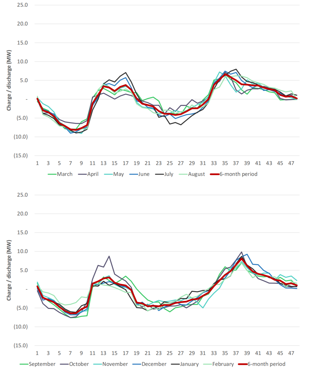 從能源市場的角度來看,圖 4 和圖 5 分別概述了 GESS 第 2 年的平均運營狀況和維多利亞州交易時段的價格。GESS的運營策略與第一年基本沒有變化,即遵循能源市場價格,早晚高峰價格對應一天中的兩種放電模式。正如第 2.2.2 節(jié)中進一步討論的,GESS 主要在清晨充電,盡管這樣做會產生網絡使用費用。