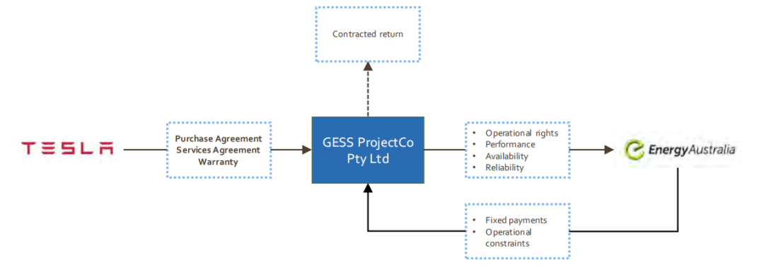 BSSA 還向 EnergyAustralia 提供電池性能、可用性和可靠性承諾,但須遵守運營限制,主要與循環(huán)次數和深度以及與共址的太陽能發(fā)電廠共享接入通道相關的調度容量限制。該電池采購協議為 GESS 提供了特斯拉對性能、可用性和可靠性的承諾。圖 2 概述了這些安排。