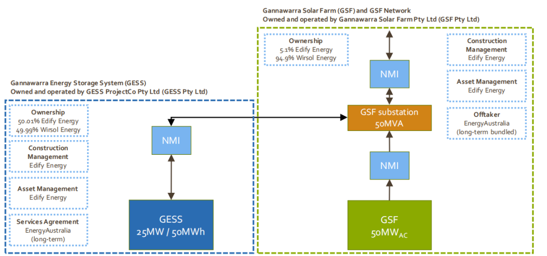GESS的實踐給出了比較理想的一類實現方式,可再生能源電站發(fā)電量的承購方和儲能電站的運營方為同一家公司( EnergyAustralia)??稍偕茉春蛢δ茈娬镜慕ㄔO(Edify )與資產管理(Edify )的投資和管理來自同樣的公司(Edify & WIRCON)。