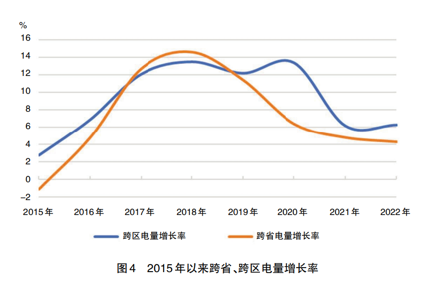 西部內(nèi)供電力需求增長。隨著高耗能產(chǎn)業(yè)西遷,西部省份的電力需求將以高于全國增速的水平快速增長,且晚于東部地區(qū)達(dá)峰,西部滿足自身用電的需求加大?!笆濉敝衅谝詠?,受東西部產(chǎn)業(yè)格局變遷、全國宏觀經(jīng)濟(jì)形勢等影響,跨省、跨區(qū)輸電量增速逐年下降,分別由2018年的14.6%和13.5%下降到2022年的4.3%和6.3%(圖4)。