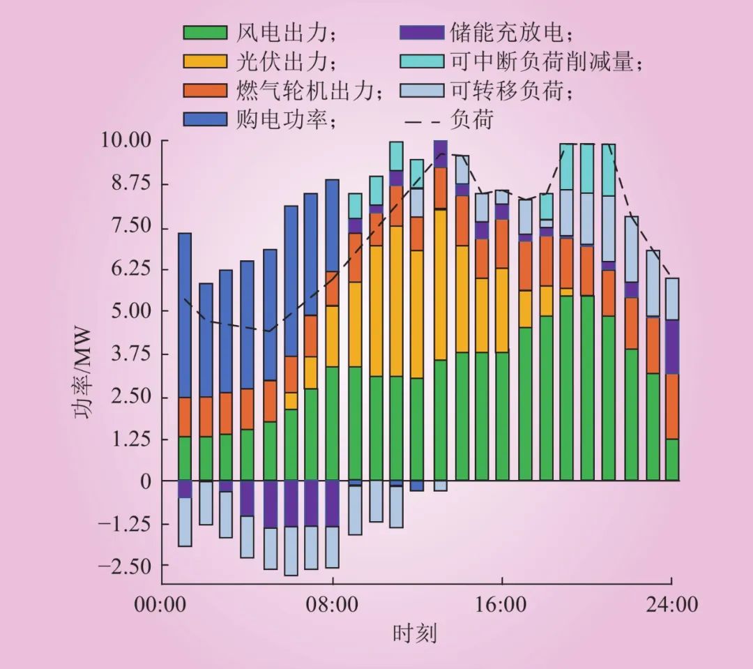 圖6為儲(chǔ)能參與電能量平衡情況,可以看出,新能源出力全部得到消納,解決了棄風(fēng)、光問(wèn)題,滿足綠色低碳要求;儲(chǔ)能幾乎全時(shí)段參與電能量平衡過(guò)程,具有雙向特性,與內(nèi)部成員CDG等聯(lián)合,根據(jù)內(nèi)部負(fù)荷與外部市場(chǎng)價(jià)格的情況綜合制定合適的發(fā)電功率,削減高價(jià)時(shí)段負(fù)荷,增加低價(jià)時(shí)段負(fù)荷,從而使VPP在購(gòu)電價(jià)格較高的13:00—18:00、22:00—次日01:00和18:00—22:00不進(jìn)行購(gòu)電,在09:00—13:00進(jìn)行售電,最大程度節(jié)省購(gòu)電成本。