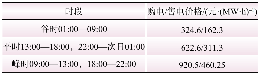 規(guī)定可轉(zhuǎn)移負(fù)荷為柔性負(fù)荷在各時(shí)段負(fù)荷的25%;預(yù)測(cè)誤差的上限為10%,允許削減時(shí)段為峰時(shí)段09:00—13:00和18:00—22:00,VPP通過(guò)配網(wǎng)進(jìn)行購(gòu)售電,峰谷時(shí)間段劃分與電價(jià)如表7所示。